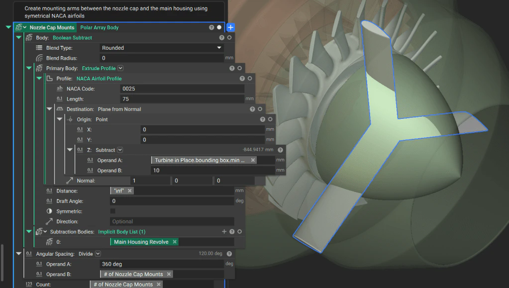 Mounting struts connect the internal nozzle cap to the outer housing. Model Struts: Use a Custom Block to generate a symmetrical 4-digit NACA airfoil profile. Extrude and Array:- Use Extrude Profile to create the strut geometry.