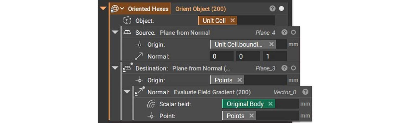 Once you have your unit cell, the Orient Object block will allow for populating your geometry. When setting up the block, your unit cell will be the Object input. It can be any geometry type but using a mesh type will allow for easy merging in the end.
