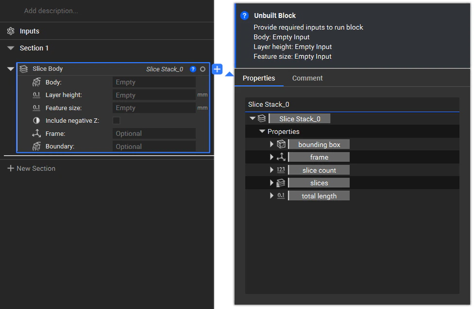 Each slice stack has the properties of slice count (how many slices are produced), slices, and total length. You can also find the cross-sectional area and the total length property within the slices options.
