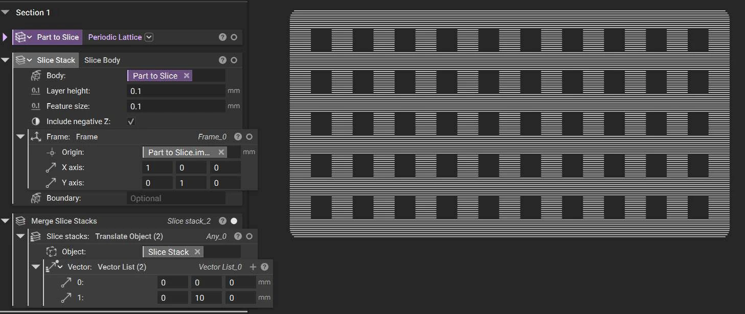 - If your part has many repetitive structures, you can slice the unit cell and translate and merge the slice stack.